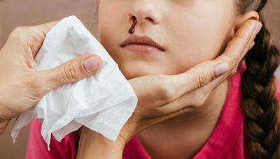 Если у ребенка начинается носовое кровотечение, не нужно класть его в кровать или просить закинуть голову назад, так как это может привести к попаданию крови в дыхательные пути. Лучше усадить ребенка, положить лед на переносицу. Если остановить кровотечение не удается, можно смочить ватный тампон в растворе перекиси водорода и осторожно вставить его в носовой проход.