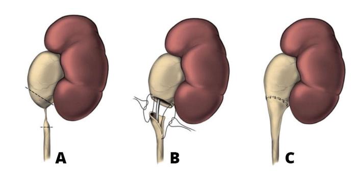 Хирургическое вмешательство при гидронефрозе предполагает удаление узкого участка мочеточника и создание нового широкого анастомоза между мочеточником и лоханкой почки.