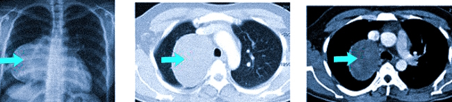 На рентгеновских снимках и КТ можно наблюдать объемное бронхогенное образование у новорожденного (стрелки указывают на патологию).