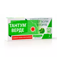 Препарат на основе бензидамина из группы НПВП, обладающий троичным воздействием: уменьшает воспаление, облегчает боль и борется с микроорганизмами. Тантум Верде рекомендуют рассасывать по 1 таблетке 3 раза в день. Курс лечения не должен превышать 7 дней. Минимально допустимый возраст пациента — 6 лет.