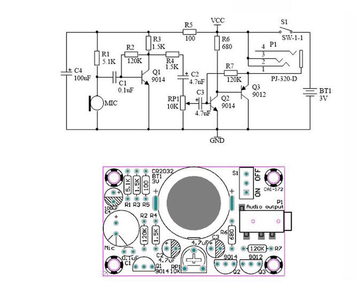 Разобрав китайский аппарат, стало ясно, почему его чувствительность оставляет желать лучшего. Схема примитивна, основана на паре транзисторов, хотя качество звука оказывается приемлемым.