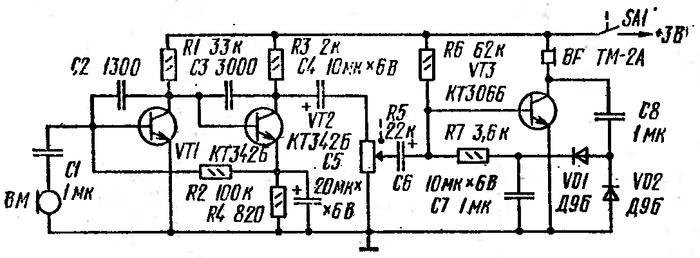 При увеличении входного сигнала, например во время громкого разговора рядом с аппаратом, сигнал на выходе второго предварительного каскада также увеличивается, и как только напряжение достигает порога срабатывания кремниевых транзисторов (0,6–0,7 В), транзистор активируется. В результате проходя через его открытый переход и резистор R6, емкость C5 разряжается, что снижает напряжение на базе первого транзистора и уменьшает чувствительность аппарата; при этом усиление постепенно нарастает по мере зарядки конденсатора C5.
