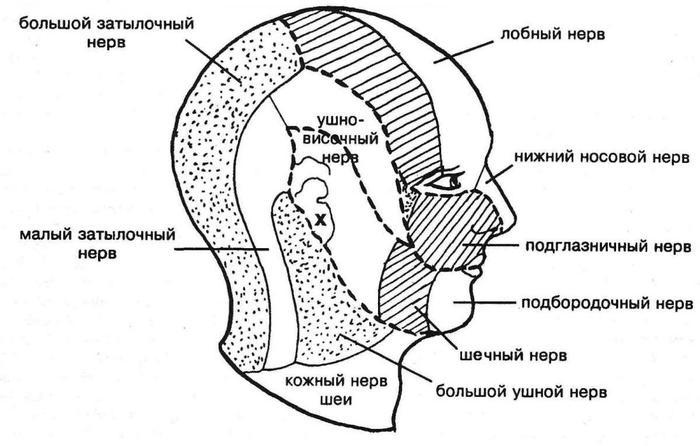 — n. occipitalis major (большой затылочный нерв) — задняя ветвь II шейного нерва, иннервирующая кожу затылочной области;