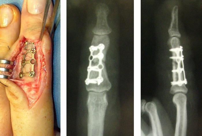 При переломах основания или головки фаланги фиксация обычно проводится спицами или винтами, в случае переломов диафиза – с использованием винтов или пластин. При многооскольчатых переломах может быть установлен внешний фиксатор.
