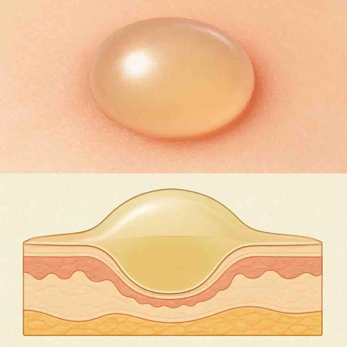 - Внешний вид: крупный пузырь более 5 мм с жидкостью.