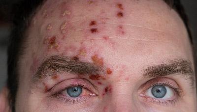 Данная форма развивается, когда вирус проникает в глазную ветвь тройничного нерва. Высыпания появляются на лице, при этом они могут располагаться на коже от уровня глаза до теменной области, резко прерываясь по средней линии лба.
