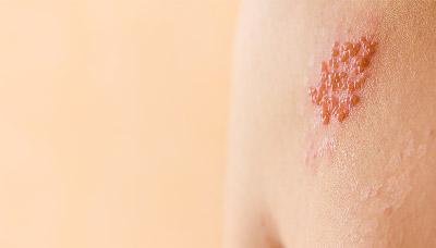Сыпь при опоясывающем герпесе выглядит как небольшие водяные пузырьки, которые с течением времени высыхают и покрываются корочкой.